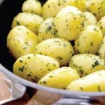 - Curatam cartofii, sau doar ii spalam bine in apa rece. Punem untul in tava, asezam cartofii intregi, presaram sare si toata verdeata tocata. Acoperim tava cu foaie de staniol. Coacem 20 minute la foc puternic. Indepartam folia si mai lasam in cuptor 5 minute.